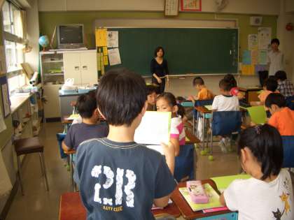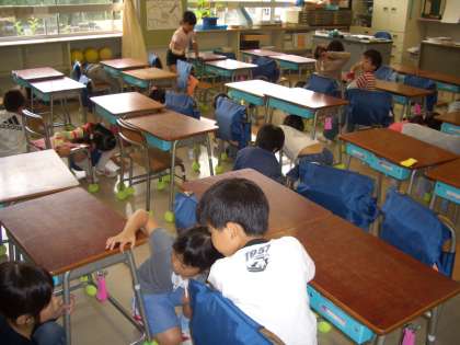 1年生は、「朝の会」の時に身の回りにごみが落ちていないか確認をしていました。日頃から、良い環境で教育活動を行っていることが伝わってきます。