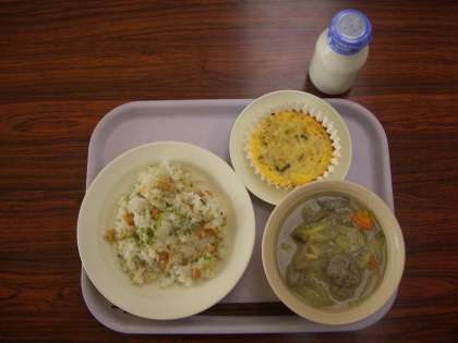 豆ごはん 牛乳 いわしのつみれ汁 切り干し大根の卵焼きです。