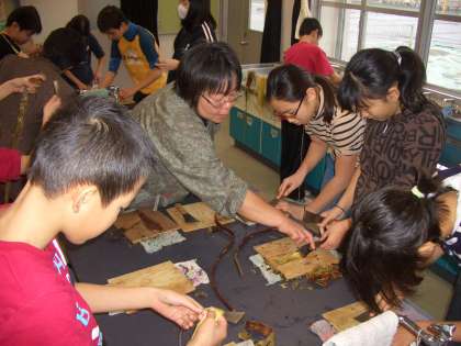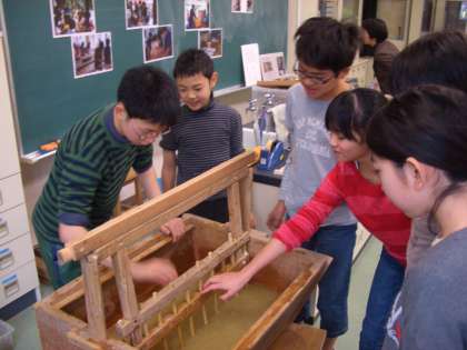 6年生は和紙づくりの職人さんの田村さんに紙すきを教えていただました。原料となるこうぞの皮を剥ぐところからの本格的な作業を体験しました。