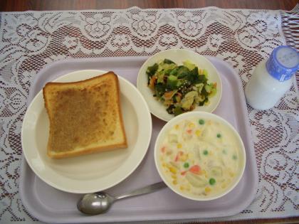 今日のメニューは、セサミトースト、コーンシチュー、わかめサラダ、牛乳です。