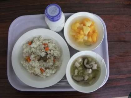 えびピラフ 牛乳 きのこスープ フルーツカクテル  です。
