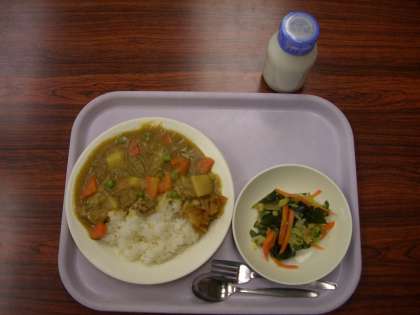 カレーライス 牛乳 福神漬け わかめサラダ  です。