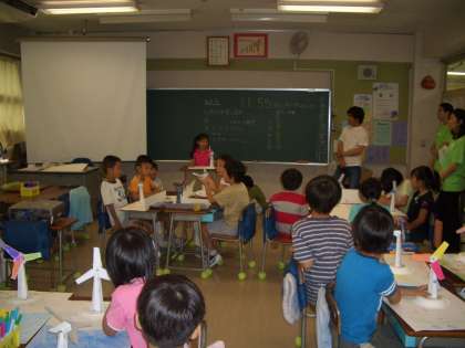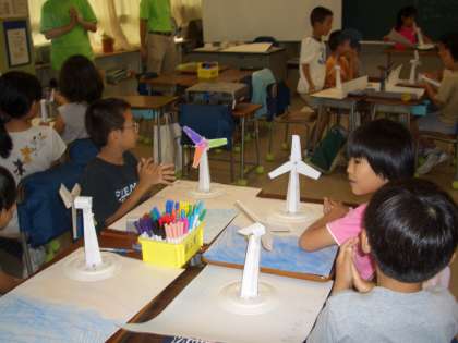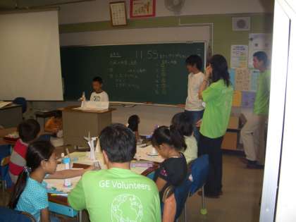3年生は、GEの方々10名余 ゲストティーチャーに環境に優しい“風力発電”について学習し、模型を作ったり、学んだことをまとめて発表したりました。
