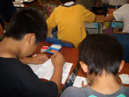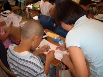5年生は、「家庭科」の授業で、“運針”の練習をしていました。男の子も真剣に取り組んでいました。早くできた子どもが教え合う場面もありました。