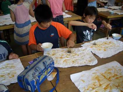 5年生は、「図工」“宝島地図つくり”をしていました。紙にしわを付けて、その上に紅茶をたらして、宝島のようにしていました。子どもたち・・・ひとりひとりそれぞれ工夫していました。今日始めての学習なので、完成が楽しみです。