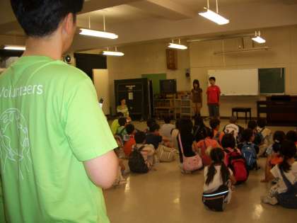 5年生は、「GE」の方々23名のゲストティーチャーと“九品仏の地域を安全で暮らし良い町にしよう”発明プロジェクト学習を行います。画面は、各班に別れて紹介をしているところです。
