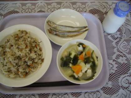 今日のメニューは、豚肉とゴボウのごはん、牛乳、味噌汁、焼きししゃもです。