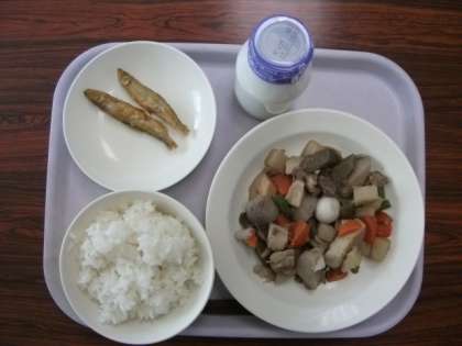 ごはん 牛乳 鶏肉と里芋のうま煮 わかさぎのカレー揚げ です。