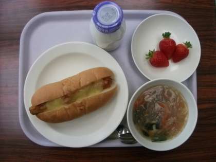 チーズチリドッグ 牛乳 春雨スープ くだもの です。