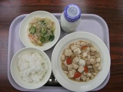 ごはん 牛乳 豆腐の五目炒め 春雨サラダ  です。