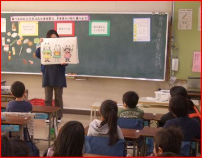 今日の5校時、1年生の教室で栄養士が担任と共に食べ物の3つのはたらきを知り、すききらいなく食べることの大切さについて授業をしました。家でも話題にしてください。