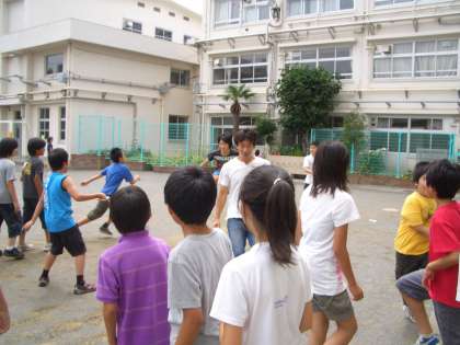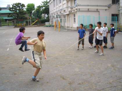 6年生は、クラスで長縄跳びの練習をしていました。跳ぶタイミングを考えて跳んでいました。