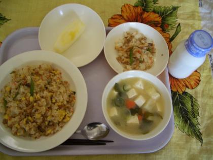 今日のメニューは、そぼろごはん、みそ汁、くだもの(りんご)、牛乳です。今日は、アレルギー対応給食を調理員が作りました。(小さなお皿のごはん)