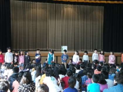 今朝、1年生を迎える会を行いました。1年生一人一人がはっきりと自分の名前を言いました。上級生は、歌で1年生を仲間入りを歓迎しました。