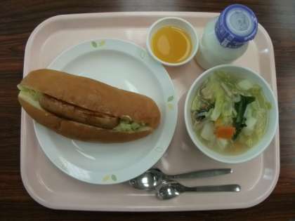 ホットドッグ 牛乳 ベーコンと野菜のスープ煮 みかんゼリー です。