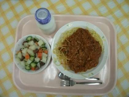 スパゲティミートソース 牛乳 マセドアンサラダ です。