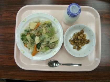 中華丼 牛乳 大豆とじゃこの甘辛あげ です。