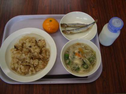 今日のメニューは、中華おこわ、牛乳、七夕汁、やきししゃも、くだものです。