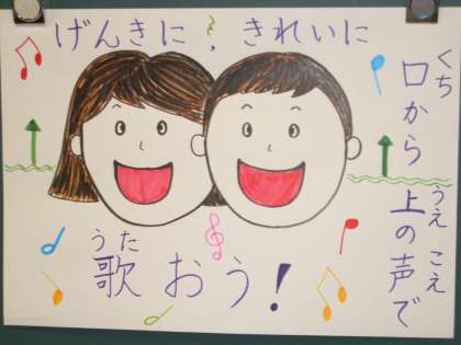 1年生は、歌うめあてをわかりやすく担任の先生が、笑顔のこどもの絵にして