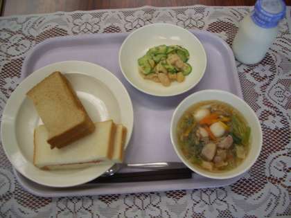 今日のメニューは、二食サンド、牛乳、春雨スープ、ビーンズサラダです。