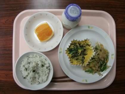 わかめじゃこごはん 牛乳 ふくさ卵 ごまあえ くだものです。