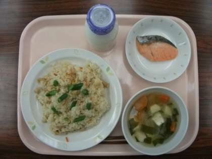 こぎつねご飯 牛乳 みそ汁 焼き魚 です。
