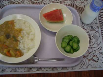 今日のメニューは、夏野菜のカレーライス、牛乳、きゅりのひとしお、くだものです。