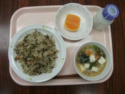 豚肉とごぼうのごはん 牛乳 田舎汁 くだもの です。