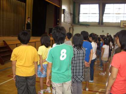 終業式の日です。式次第は、礼−校長先生の話−児童代表のことば(2年生)−校歌斉唱−礼です。校歌斉唱の伴奏は、6年生児童でした。とても上手でした。