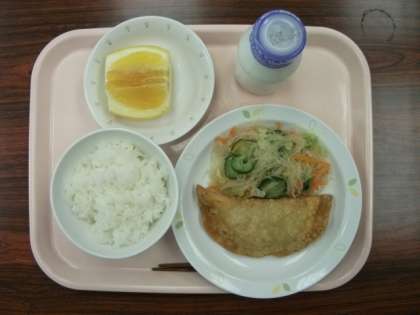 ごはん 牛乳 ジャンボギョーザ 春雨サラダ くだもの です。