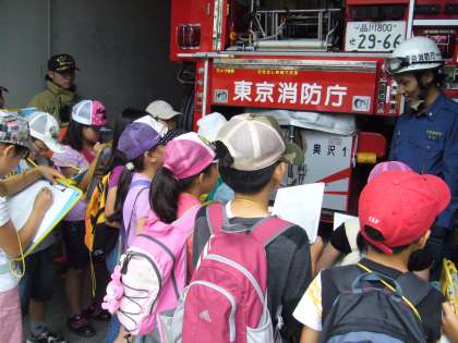 玉川消防署奥沢出張所に出かけました。消防署の仕事について、教室では学べないことをたくさん学んできました。奥沢出張所のみなさん、実演を交えたわかりやすい説明をありがとうございまいした。