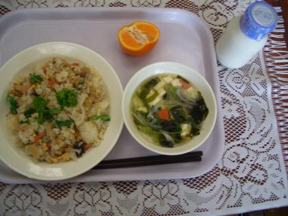 今日のメニューは、菜の花寿司、すまし汁、くだもの(ぽんかん)、牛乳です。子どもたちも大喜びで、おいしくいただきました。