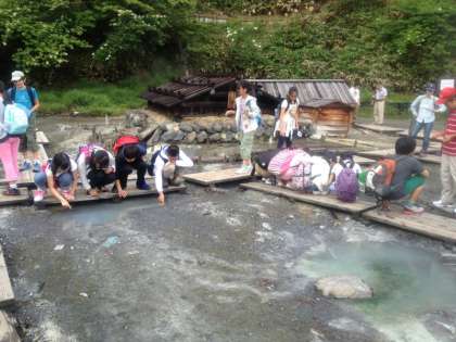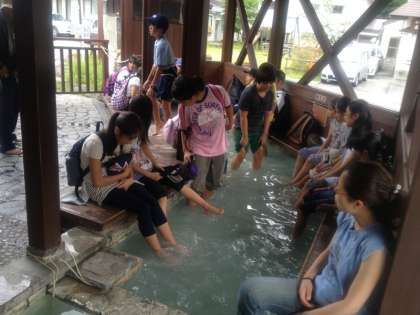 湯元源泉では、後のハイキングに向けて、足湯につかりました。
