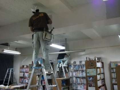 新学期に間に合うように、世田谷区教育委員会の施設課の方々が図書室の壁の塗り替え作業をしてくださっています。