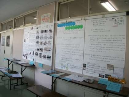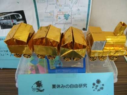 長い夏休みが終わり、日焼けした元気な顔がもどってきました。夏休みの作品が教室前に展示されています。「金の機関車」を制作した3年生の男子は、先頭の部分を丁寧に折ったこと、機関車を支える車輪の部分を頑張って作ったそうです。