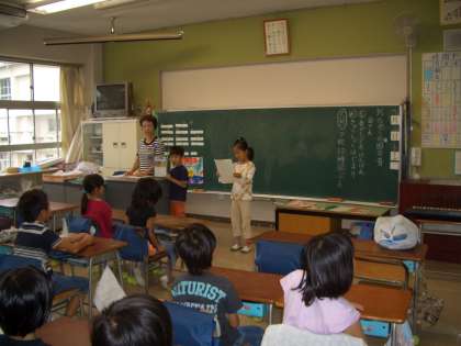 2年生 − 「夏休みの思い出」の作文をもとにして、スピーチをしていました。具 体的な内容でした。聞いている子どもたちもみんな真剣そのものでした。