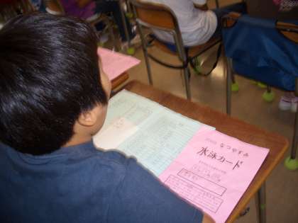 6年生 − 夏休みにに取り組んできた水泳指導の「自分の記録のベスト」を水泳カ ードの記入し、明日行われる八幡小学校との水泳記録会のエントリーを確 認していました。