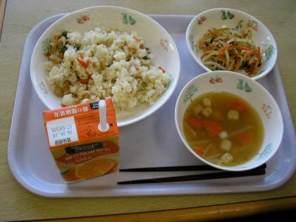 今日の献立は「こぎつねごはん、牛乳、あんかけ汁、野菜のごまだれかけ」でした。