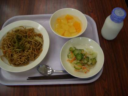 今日の献立は、そーす焼きそば、牛乳、野菜の甘酢かけ、フルーツポンチです。