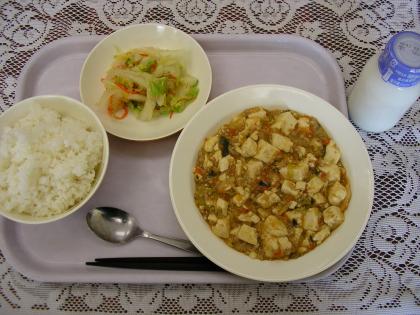 今日のメニューは、マーボ豆腐、ご飯、辣白菜、牛乳です。