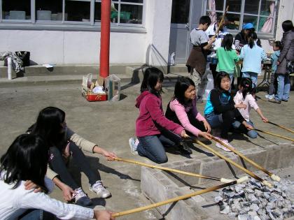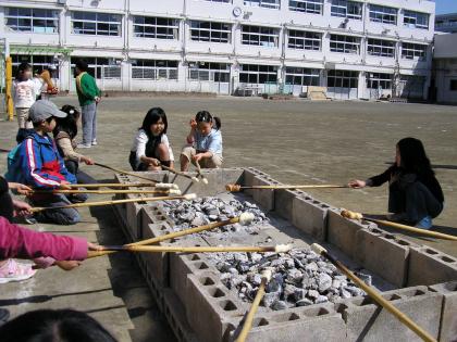 「遊ぼうパン」とは、遊び場開放委員と子どもたち、そして保護者が一緒になり、パンのきじを作り、ねかせ、それを竹の棒につけて炭火で焼き、茹でソーセージやジャムなどをはさみ、おいしく食べる…という、「まさしく遊びながらできてしまうパン」です。子どもたちは、初めての体験に大騒ぎ。目を輝かせながら、パン作りに没頭していました。