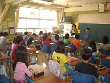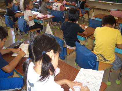 2年生教室では、“宿題の答え合わせ”を係の子ども中心に行っていました。正しい答えを聞き、各自がまるつけをし、隣りの児童と確認し合っています。