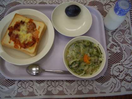 今日の献立は、ピザトースト、牛乳、ヌードルスープ、くだものです。