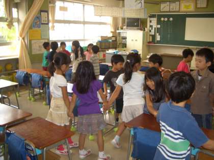 1年生の教室では、グループの子ども同士、先生も入って、「おはよう あくしゅ」で元気に一日がスタートします。歌詞を全部覚えていて、はっきりと歌っていました。