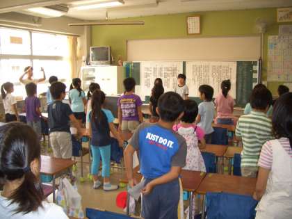 2年生の教室では、おなかにてをあてて、発声練習をしてから、「にじ」の歌をきれいな声で、しかも大きな声で上手に歌っていました。