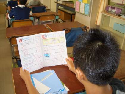 6年生の教室では、「算数科:少人数指導」の準備。準備中の児童は、既習事項の確認をワークブックを見ながらしていました。6年生の算数では、難しいといわれている“単位量”“体積”のページを見ていました。