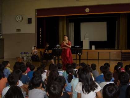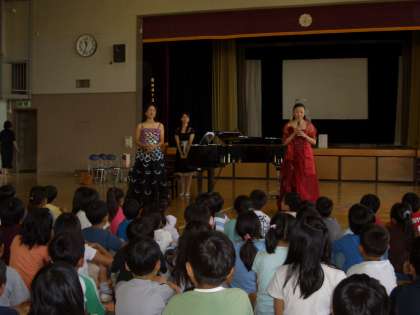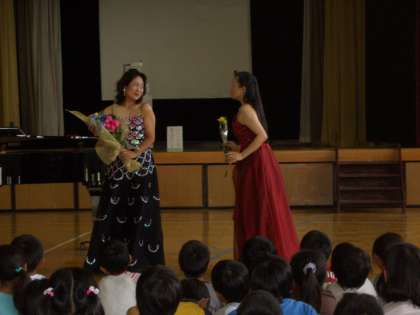 今日の4時間目に、「音楽鑑賞会」を行いました。土屋栄子さん、小方まゆみさん共に二期会会員でオペレッタなど幅広く音楽活動をされている方の歌を聴きました。