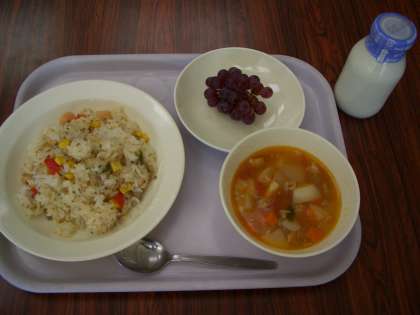 今日の献立は、ナシゴレン、牛乳、ミネストローネ、果物です。