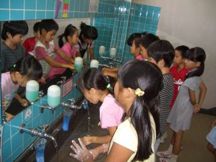 子どもたちは、教室に戻るときに「うがい・手洗い」を励行しています。「咳エチケット」も守っています。