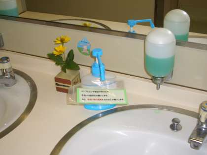 手洗いの石鹸も常備して、活用しています。今回さらに「給食前の手洗いの強化」のために、“シャボネット”薬用泡石鹸も各階に用意しました。今朝の全校朝会時に保健主任から説明がありました。さらに、職員のトイレの手洗い場には、石鹸で手洗い後に、手を消毒する“ウエルパス消毒液”も設置し予防を強化しています。